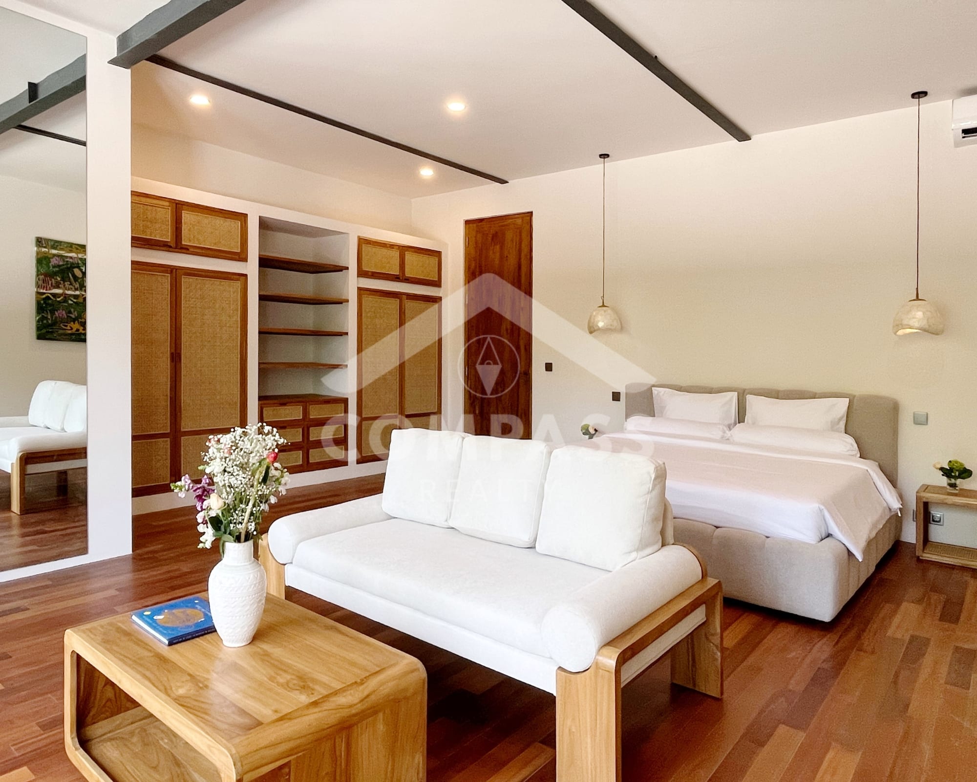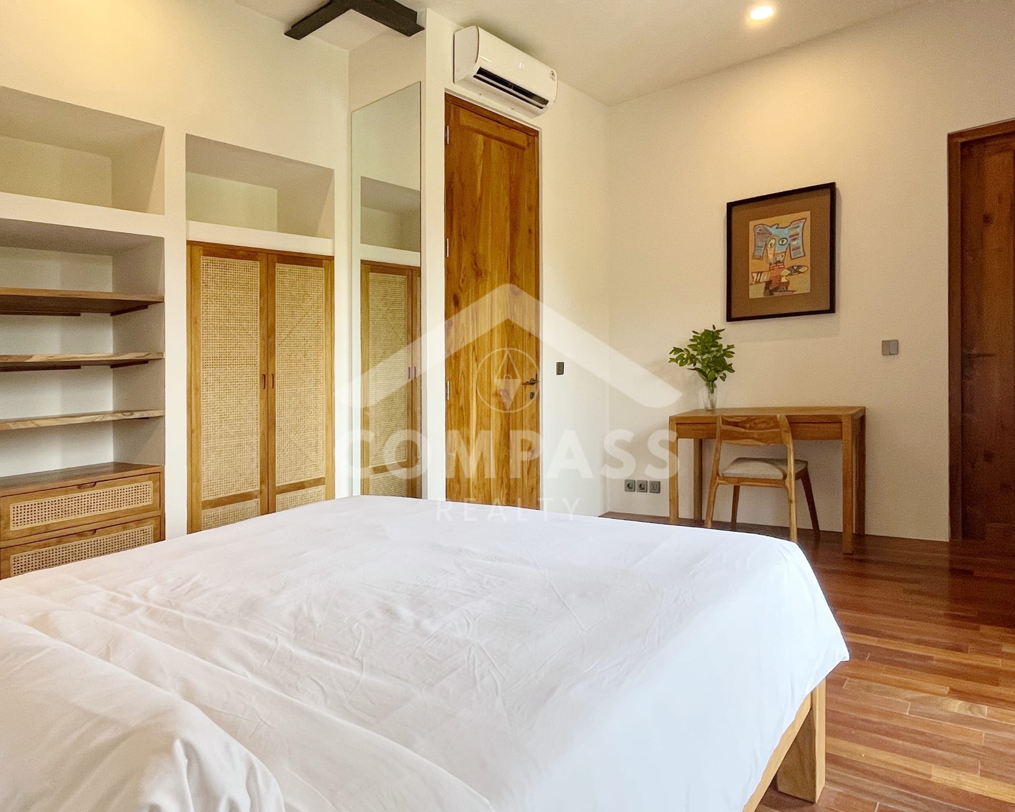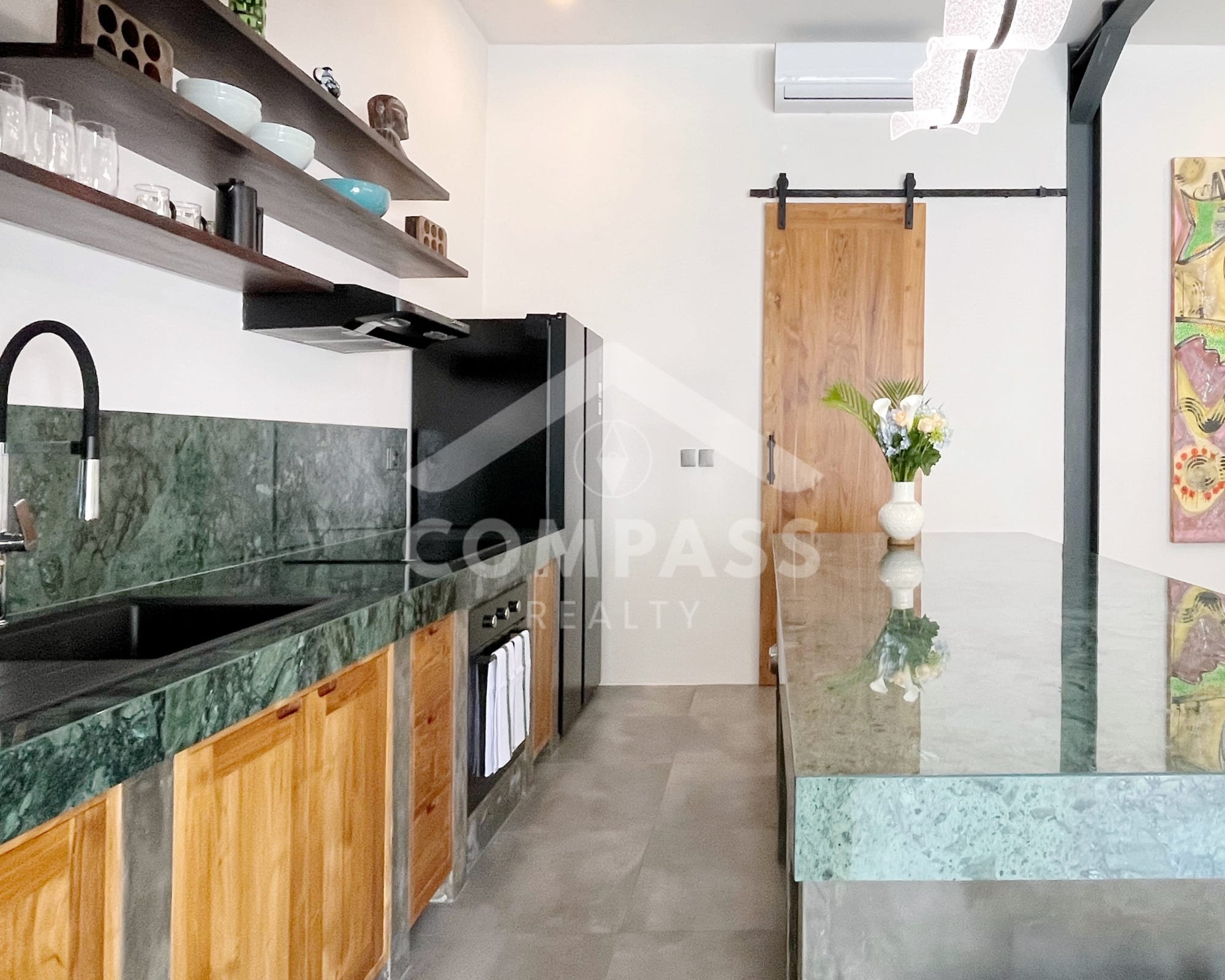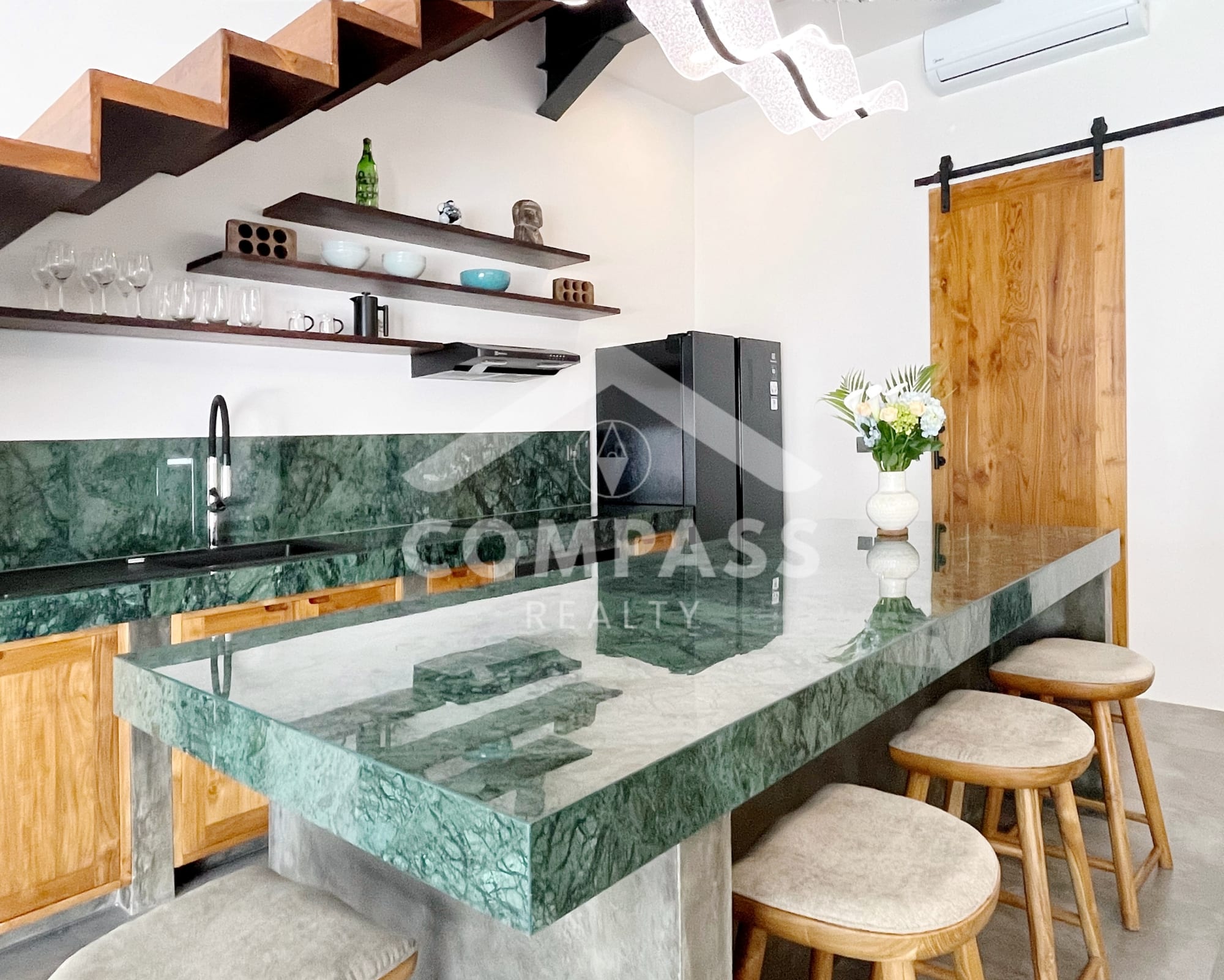 High-end finishes are evident in the choice of materials, from bengkirai and teak wood, marble in the kitchen and bathrooms, to high-quality, durable door frames. The home is also equipped with high-quality appliances, such as Electrolux, Hafele, and Midea kitchen appliances, as well as a 60-inch Samsung TV.