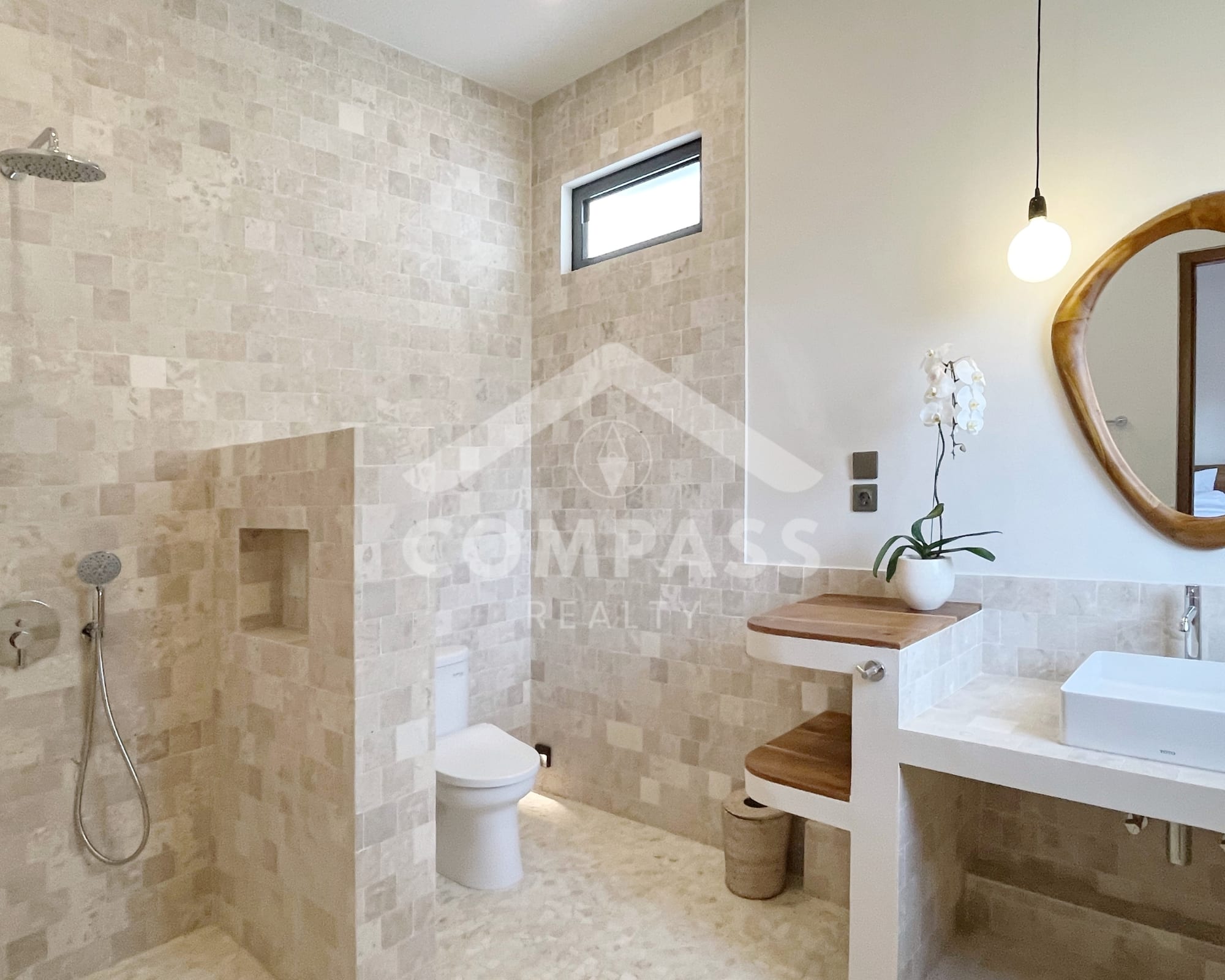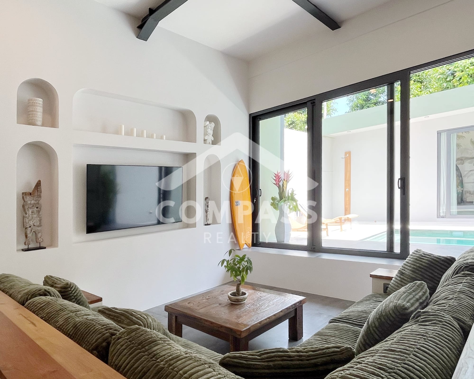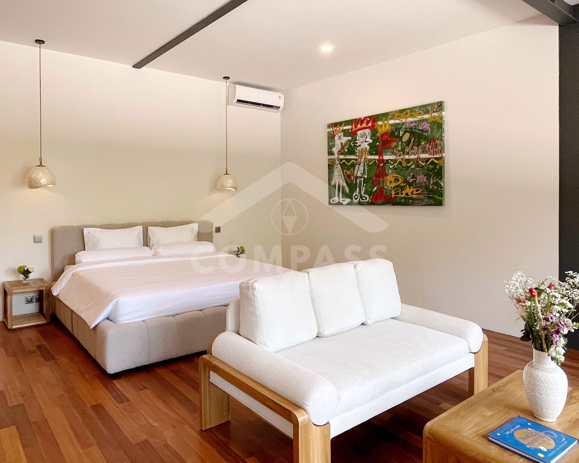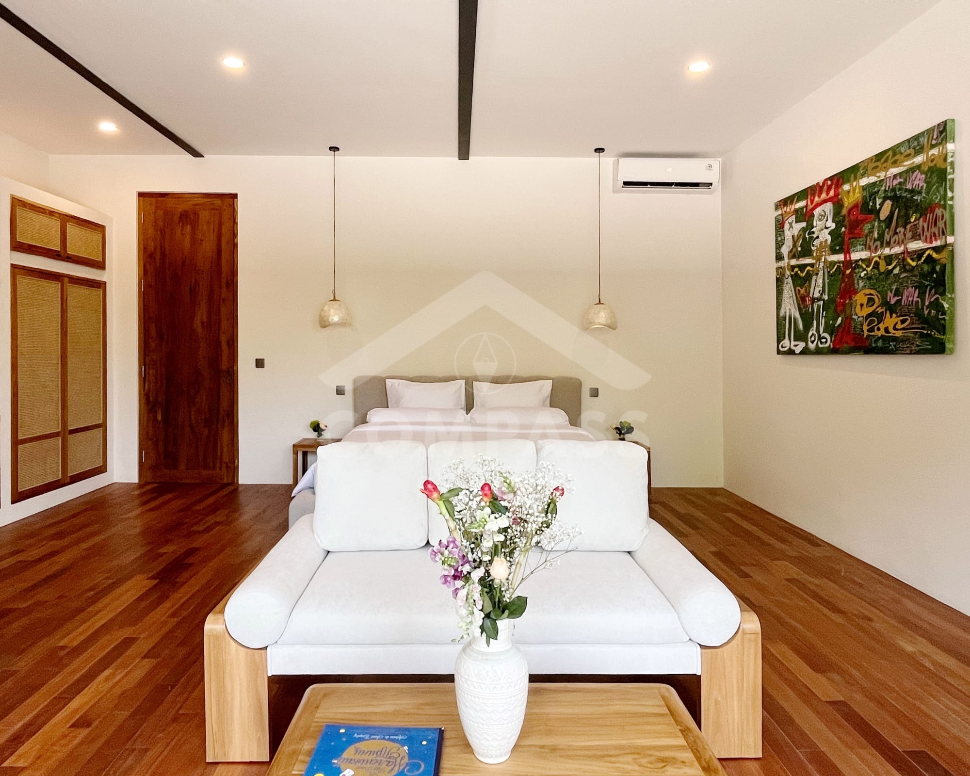 High-end finishes are evident in the choice of materials, from bengkirai and teak wood, marble in the kitchen and bathrooms, to high-quality, durable door frames. The home is also equipped with high-quality appliances, such as Electrolux, Hafele, and Midea kitchen appliances, as well as a 60-inch Samsung TV.
