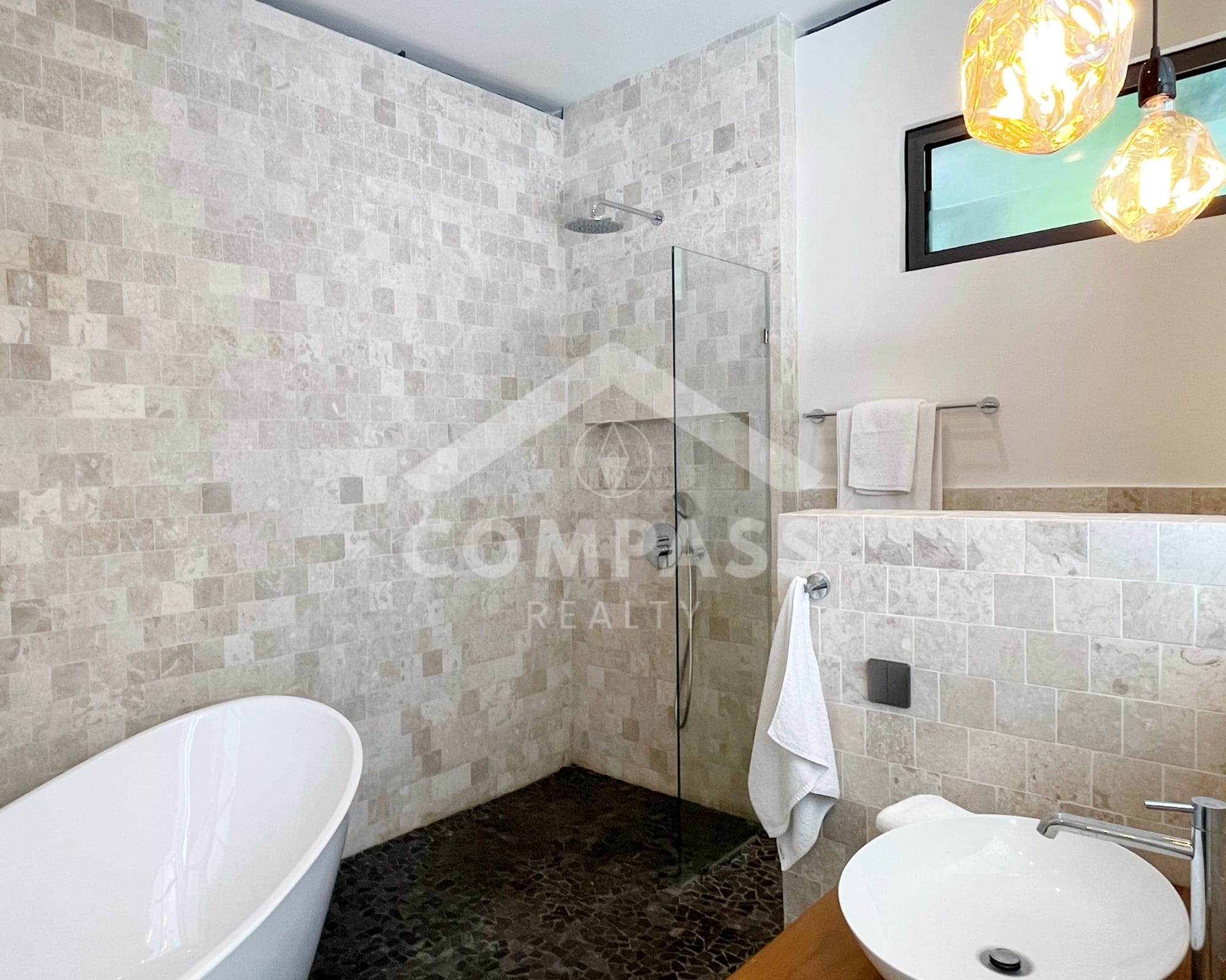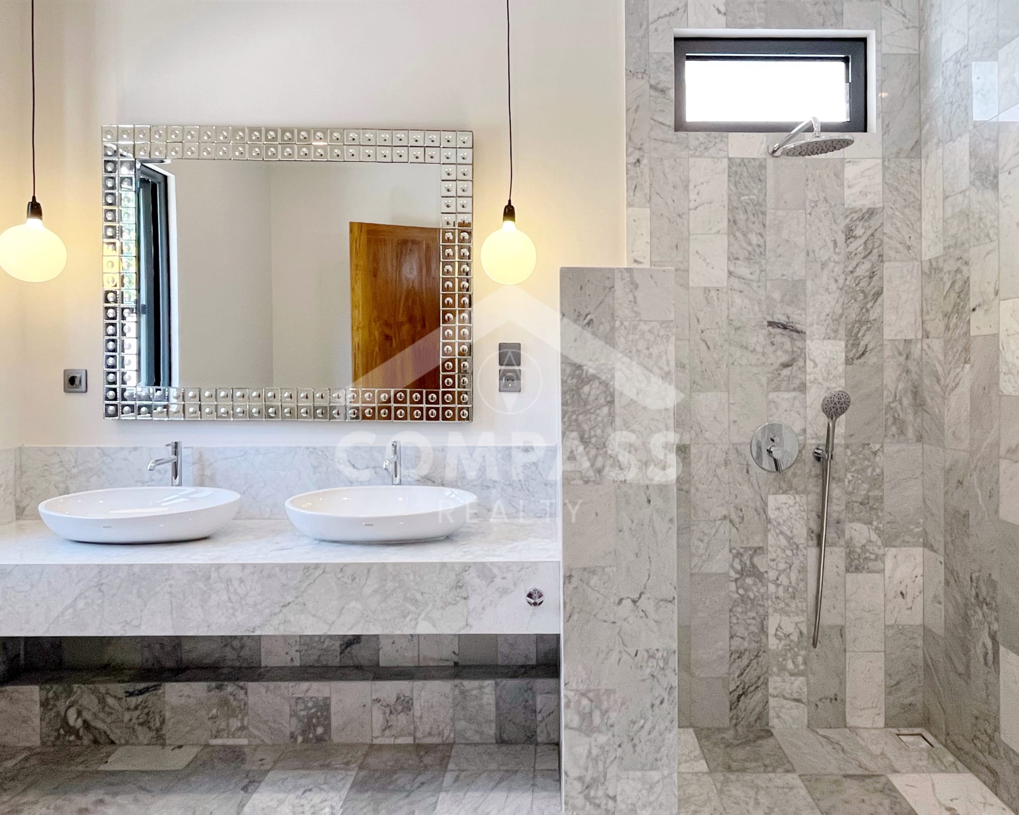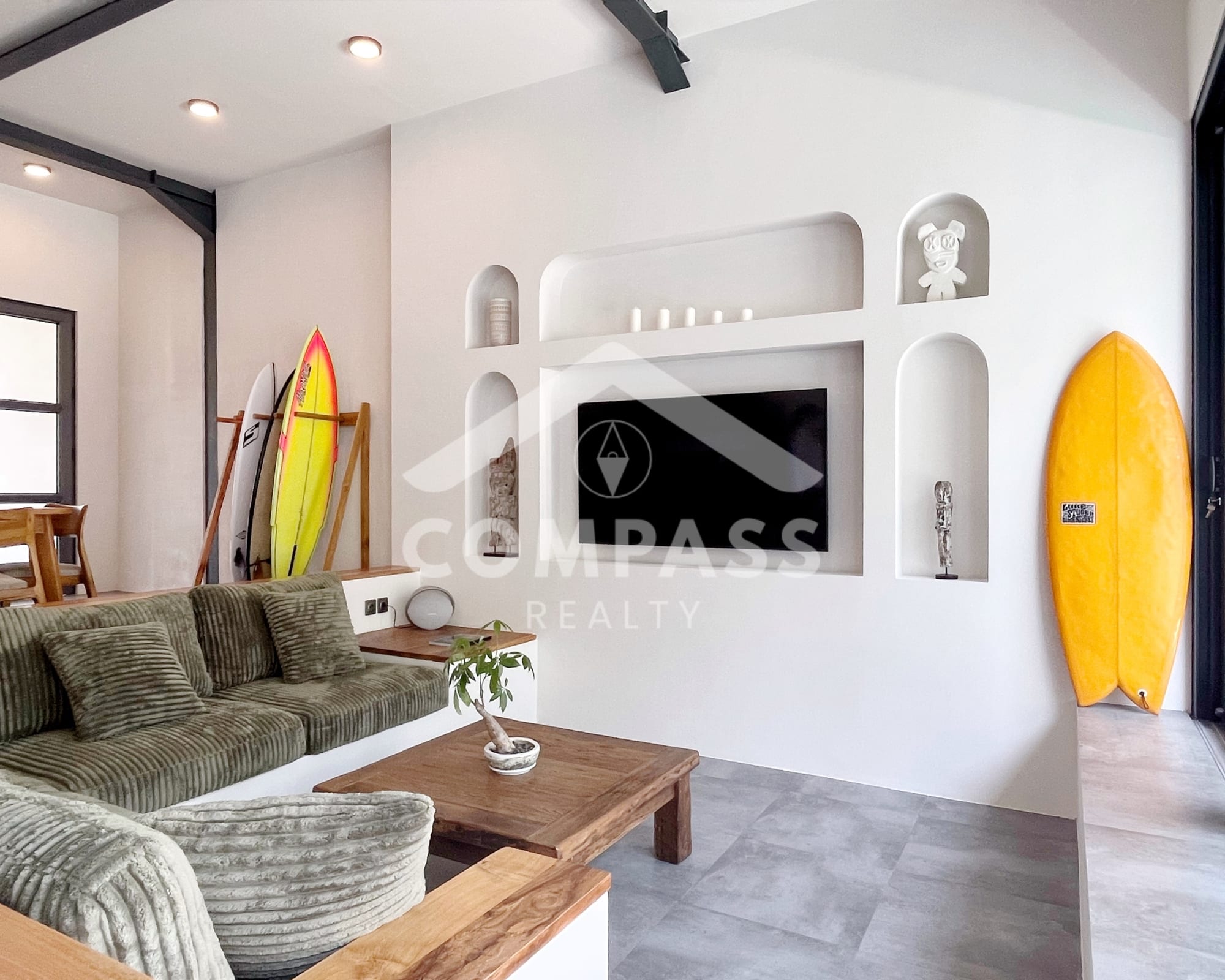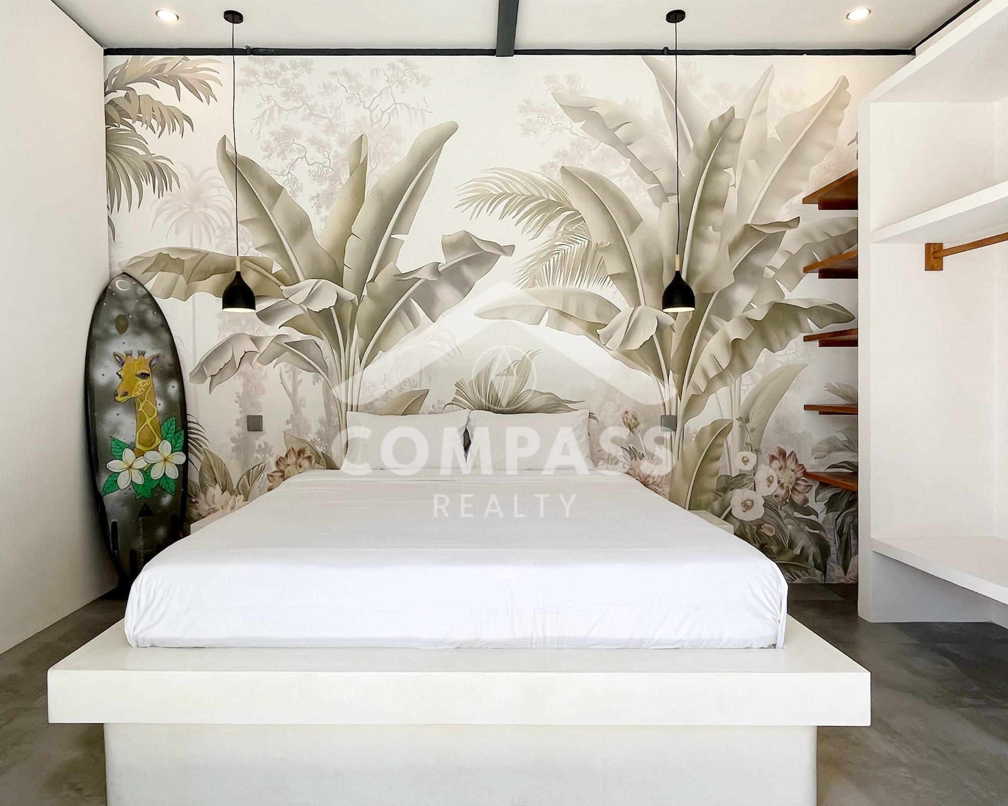 High-end finishes are evident in the choice of materials, from bengkirai and teak wood, marble in the kitchen and bathrooms, to high-quality, durable door frames. The home is also equipped with high-quality appliances, such as Electrolux, Hafele, and Midea kitchen appliances, as well as a 60-inch Samsung TV.